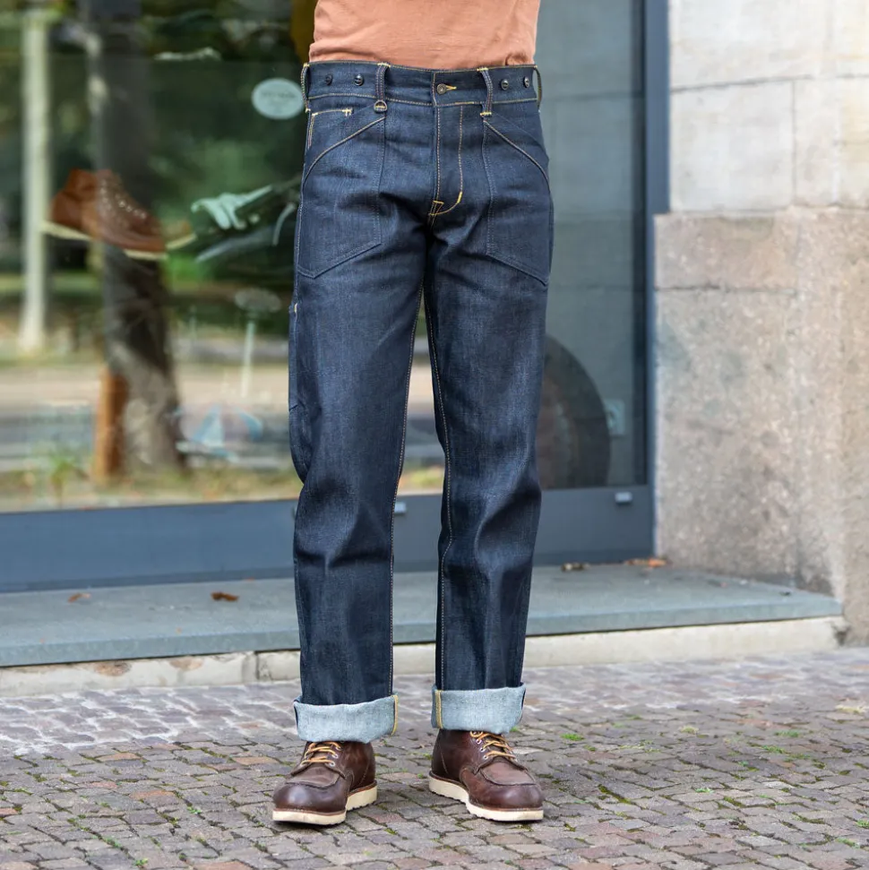 Die 1936 Chopper Pant der Pike Brothers hat ihren Ursprung im Handwerk des frühen 20sten Jahrhundert. Typische Details waren damals die aufgesetzten vorderen Taschen und eine Zollstocktasche am Oberschenkel. Wie Arbeitshosen aus dieser Zeit war der Schnitt sehr weit und der Bund hoch, da sie als Überhosen gedacht waren. Hosenträgerknöpfe und ein Taillenriegel waren feste Bestandteile dieser Hosen. All diese Details finden sich auch an 1936 Chopper Pant der Pike Brothers. Der weite Schnitt und hohe Bund sind besonders bequem und bieten eine sehr gute Bewegungsfreiheit. Die großen Taschen an der Vorder- und Rückseite bieten viel Stauraum und auch die typische Zollstocktasche fehlt nicht. Als zusätzliches Detail findet sich auch der D-Ring an der Vorderseite, welche für die Kette der Taschenuhr gedacht war. Natürlich fehlt auch die dazugehörige kleine Tasche für die Uhr nicht.