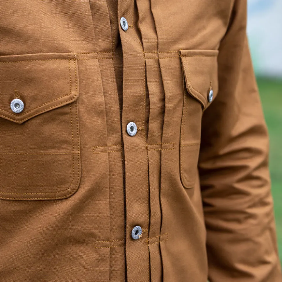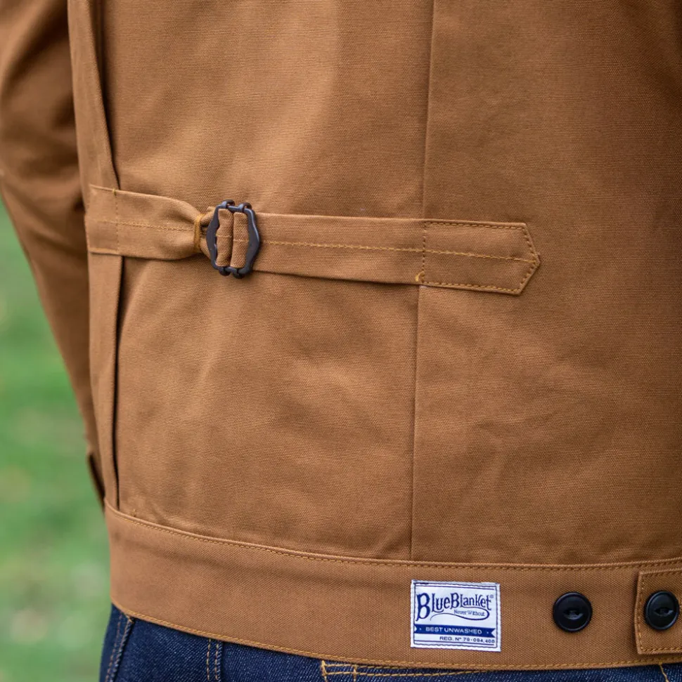 Twilljacke mit 2 Fronttaschen und vernähten Falten, verstellbare Schließe am Rücken und seitliche Knöpfe zum Verstellen