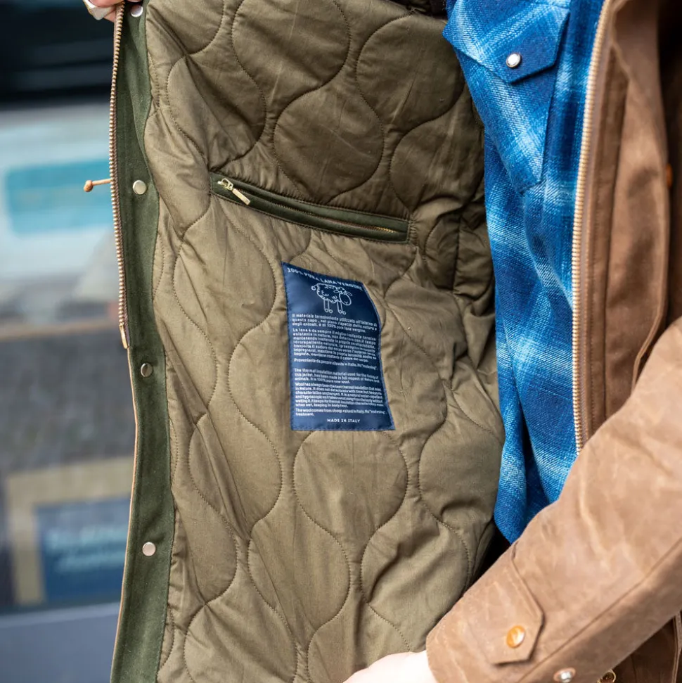 Gewachste lange Herbst- und Winterjacke 7075WX mit Zweiwege-Reißverschluss und Knopfleiste mit Druckknöpfen, einer Brusttasche mit Reißverschluss, einer Innentasche mit Reißverschluss, 2 große Fronttaschen mit Klappe und Druckknopf, Kapuze, verstellbare Taille und elastischem Kordelzug am unteren Ende. Jeder Knopf ist mit Leder unterlegt. Die Kapuze hat Kordeln an der Vorder- und an der Rückseite. Die Jacke ist gefüttert und hält auch strenger Kälte stand.