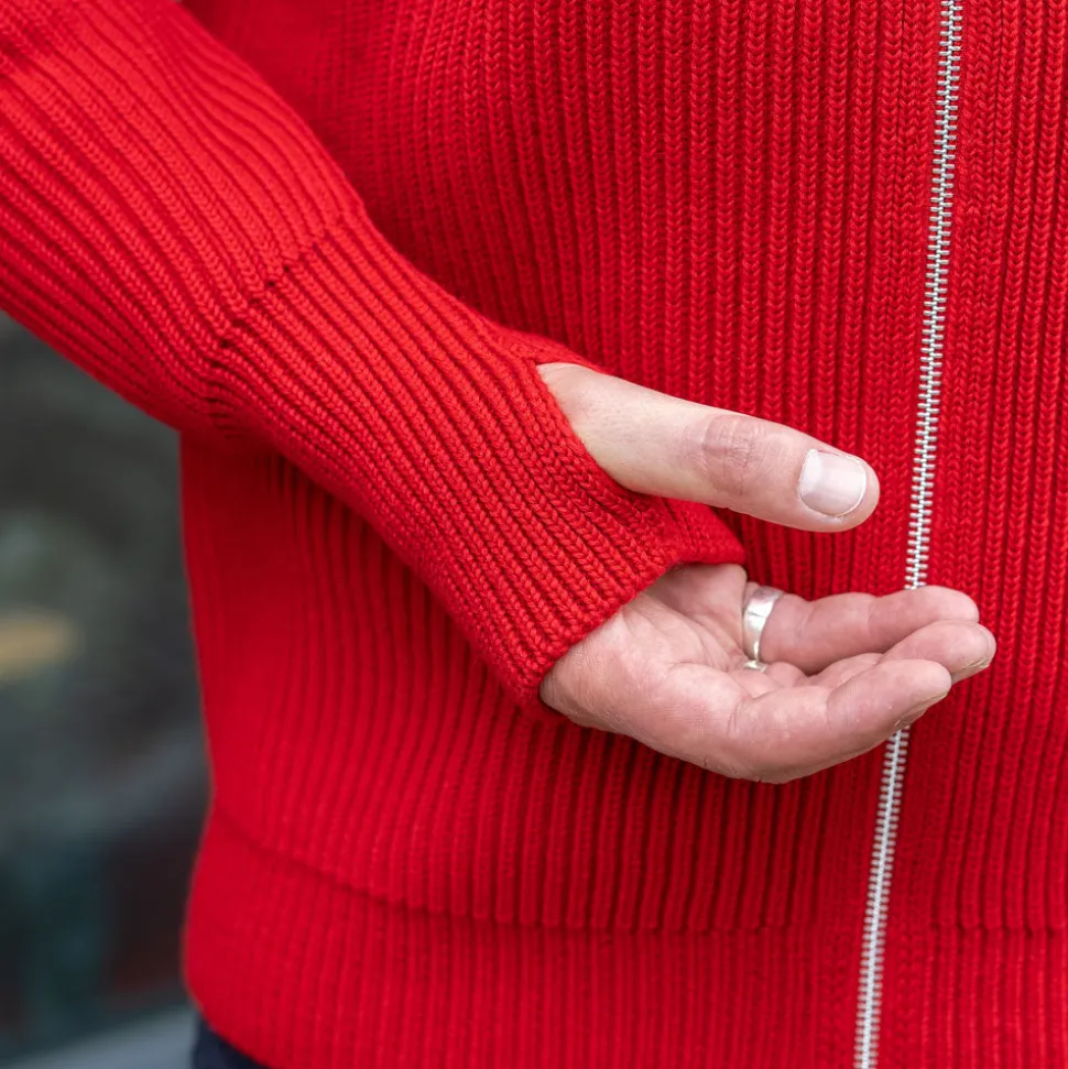 Cardigan mit Reißverschluss, gestrickt im Cardigan-Vollstich. Das Modell hat eine reguläre Passform mit hohem Kragen und verlängerten Ärmelbündchen mit Daumenlöchern. Modisch gestrickt und verkettet. Alle Baugruppen sind mit Riegeln verstärkt. Kommt mit einem nickelfreien Zwei-Wege-YKK-Reißverschluss. Gestrickt auf einer 5-Gauge-Flachstrickmaschine mit 6 Fäden extra gesponnener, reiner Schurwolle für eine schwere und langlebige Qualität. Die Wollfasern werden sorgfältig gereinigt und anschließend gekämmt, um gebrochene und kurze Fasern zu entfernen. Dann wird dem Garn eine zusätzliche Drehung gegeben, um ein dichteres, haltbareres Garn zu erhalten, das weit weniger pillt.