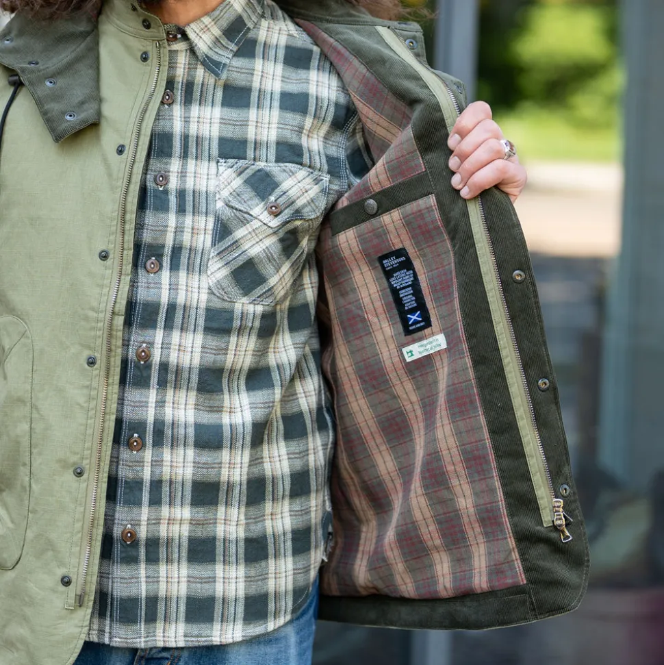 Leichte, wasserabweisende Windjacke im Country Style mit zwei großen Doppeltaschen auf der Vorderseite, abnehmbarer Kapuze, Cordkragen, Verstellspangen und Patches am Ärmel, poliertem 2-Wege Reißverschluss aus Italien und zwei geknöpften Taschen und einem abnehmbaren Tragegurt innen. Das Obermaterial ist der 163g/qm schwere R105 Cotton Ripstop von Halley Stevensons, ein wasserdichter, superleichter Outdoorstoff aus Schottland. Er ist schmutzabweisend und für die Handwäsche geeignet. Gefüttert ist die Jacke mit Highland Tartan Lining und olivgrünem Baumwollcord von Brisbane Moss/England.