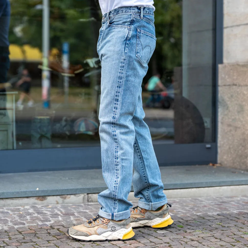 Die Regular Straight Jeans werden in Japan aus 14oz Kurabo Recycle Red Selvage Denim aus 100 % Baumwolle hergestellt. Mit ihrem regulären, geraden Schnitt, der hohen Leibhöhe und dem klassischen Five-Pocket-Design mit Knopfleiste bieten sie eine klare und vielseitige Silhouette. Die Blue Light Used-Waschung verleiht dem Denim einen weichen, leicht eingetragenen Look. Mit einem Patch aus 100 % Zellstoffpapier auf der Rückseite spiegelt dieses Stück die Handwerkskunst und Liebe zum Detail wider, die EDWINs „Made in Japan“-Kollektion auszeichnen.