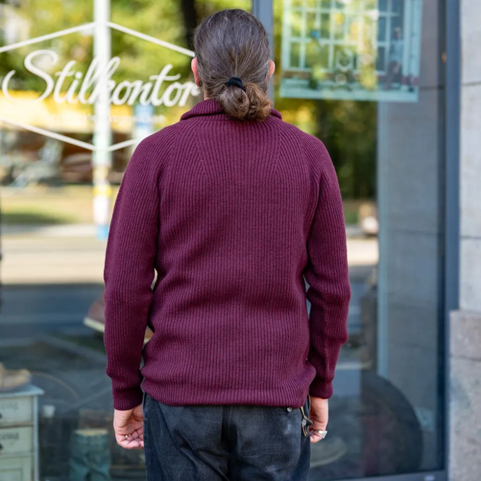Drei Fäden feinster GOTS zertifizierter Schurwolle sind plattiert und zweifarbig verstrickt. Ein Fadensystem läuft auf der „linken“ Warenseite und eins auf der „rechten“, außen sichtbaren Warenseite. Die Zweifarbigkeit bringt diese besondere Stricktechnik je nach Farbkombination mehr oder weniger zum Vorschein. Der Aufwand wird entlohnt durch eine außergewöhnliche Farbmelange mit Tiefeneffekt. An Land oder auf hoher See, der praktische Reißverschluss am hohen Kragen ersetzt schnell einen Schal und ist ebenso schnell wieder geöffnet wenn die Sonne scheint!