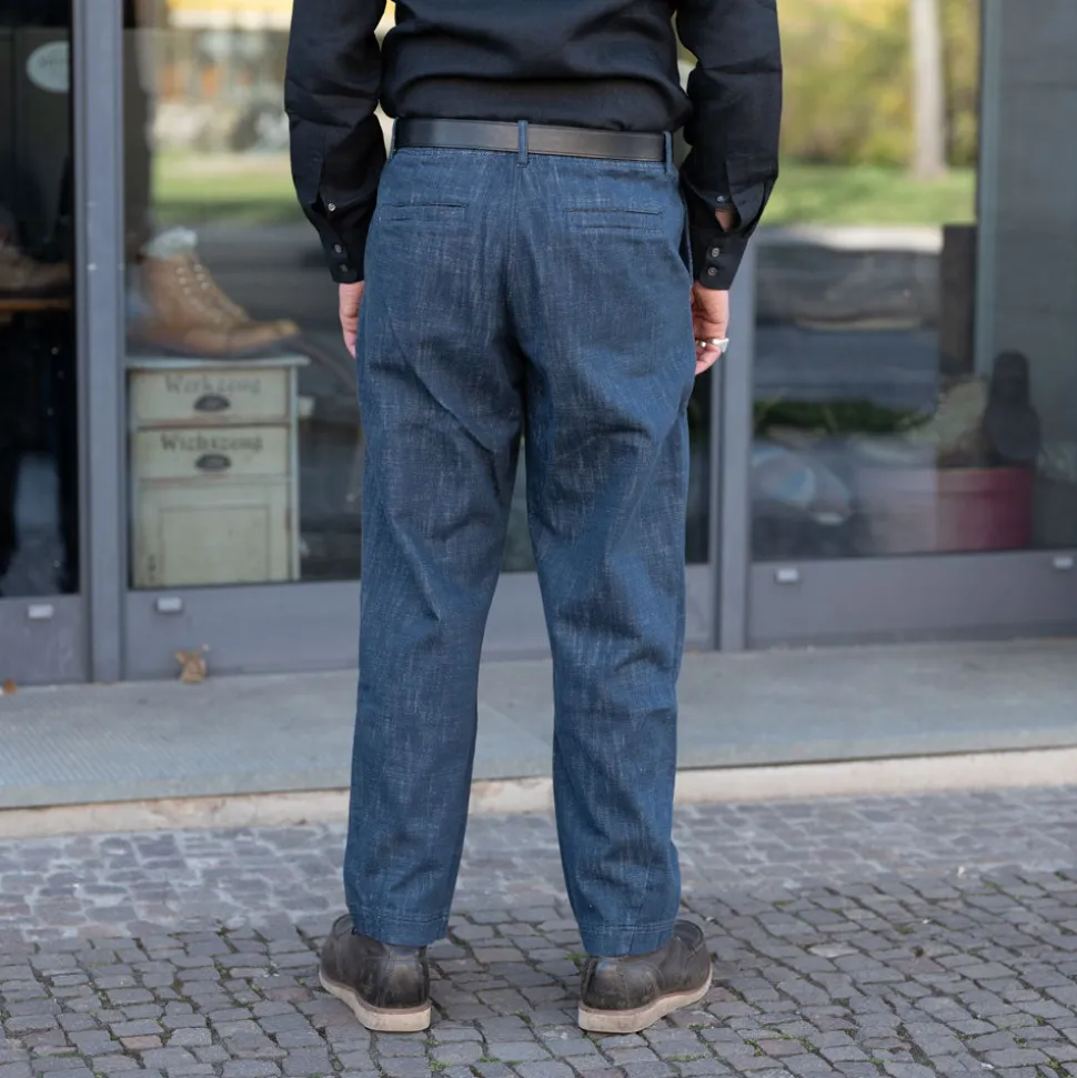 TRYGVE ist eine locker sitzende, leicht tapered und leicht verkürzte Hose. Sie verfügt über zwei schräge Fronttaschen, zwei Leistentaschen und einen Hosenschlitz mit Reißverschluss. Die Seitennähte sind leicht verdreht, was dem Stoff vom Knie abwärts eine organische Form verleiht. Schlicht daherkommend offenbart dieser italienische Stoff bei näherer Betrachtung eine reich strukturierte Oberfläche, die durch stark geflammtes Garn entsteht, das ungleichmäßig gefärbt ist und so einen Denim-Look erzeugt. Die lockere Verspinnung dieser Garne macht den Stoff sehr weich und angenehm zu tragen, ohne dabei an Strapazierfähigkeit einzubüßen.