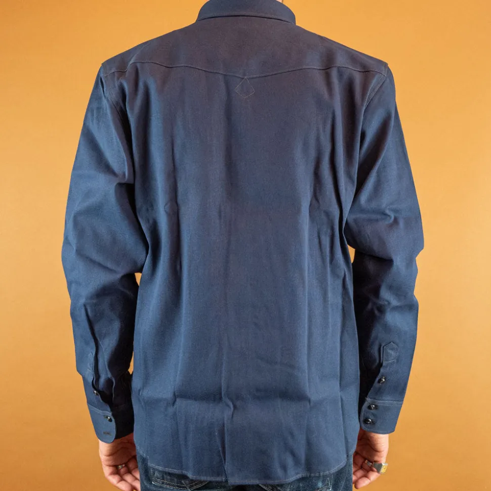 Western-inspiriertes Hemd aus 6,5 oz Yambaru Selvage Denim-Stoff. Mit zwei Brusttaschen vorne, abgerundeten Knöpfen und dem charakteristischen Indigofera-Stichdetail an der Rückenpasse.