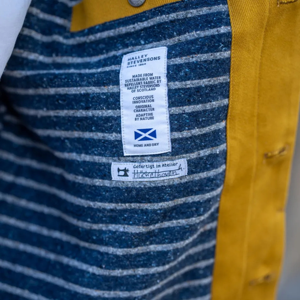 Schwere, wasserabweisende Jacke mit zwei großen Doppeltaschen mit Patten auf der Vorderseite, Verstellspangen am Ärmel, verdeckter Knopfleiste und zwei geknöpften Taschen und einem abnehmbaren Tragegurt innen. Das Obermaterial ist der 512g/qm schwere 12oz. Rugged Twill cotton von Halley Stevensons, ein massiver Köperstoff aus Schottland. Er ist reimprägnierbar, schmutzabweisend und mit einem Schwamm zu reinigen. Gefüttert ist die Jacke mit wattiertem, gestreiften Blanket look Lining aus GRS zertifizerten recycleten Naturmaterialien von Bassetti. Der Torso ist mit 100g/qm performance_Wattierung aus recycletem Polyester gefüttert. Der Ärmel ist für bequemeres Anziehen mit in Deutschland gestepptem Viskose Steppfutter mit 100g/qm Wattierung gefertigt. Die Jacke ist weit geschnitten.